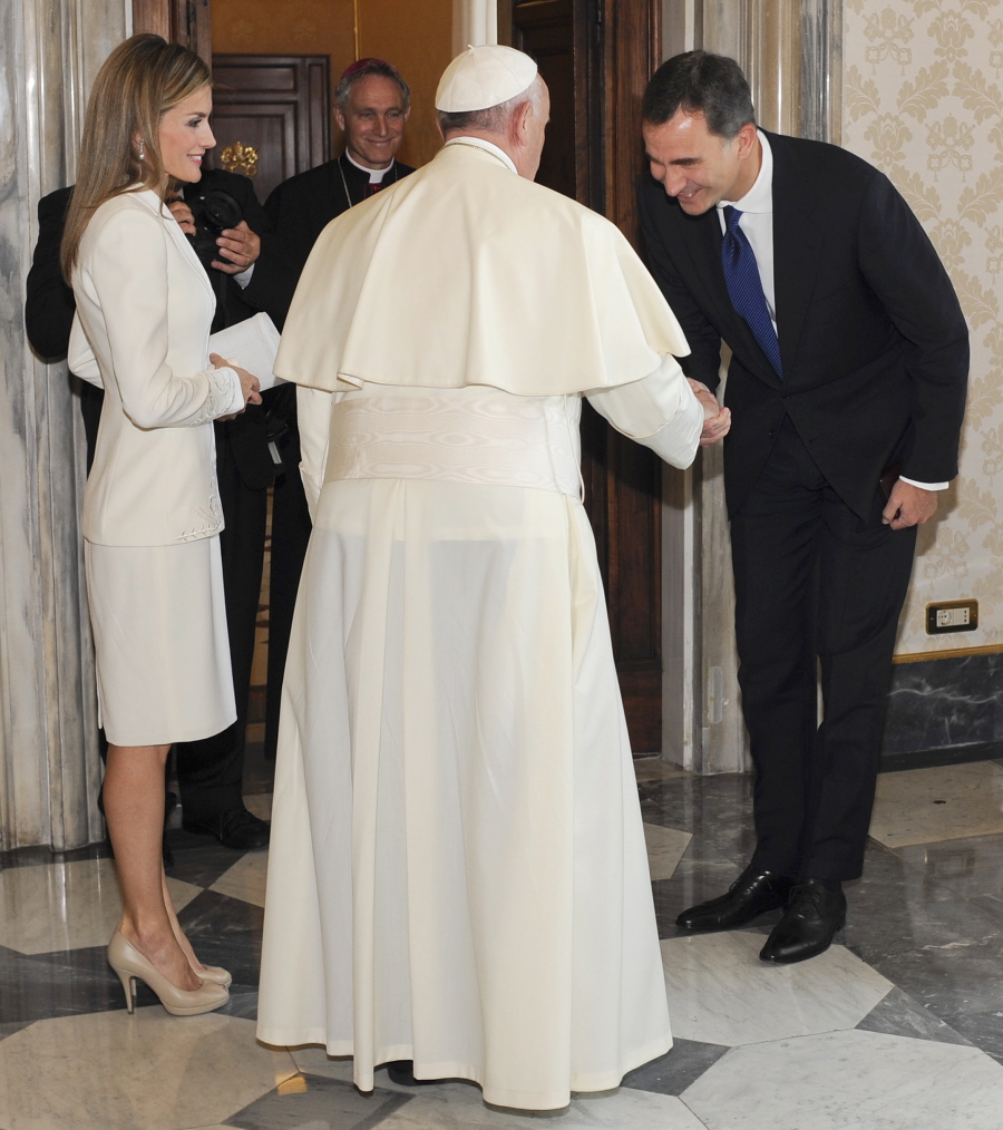 I’m also including some photos of Felipe and Letizia’s trip to the Vatican earlier this week, where they had a private audience with Pope Francis. This was the first meeting between Francis and Felipe since Felipe became King. I was side-eyeing the length of Letizia’s skirt here, so I had to double-check the papal-audience dress code. Apparently, you still get to see the Pope when you’re wearing a knee-length skirt. Letizia barely made it. Again, her top half looks fine – she always looks professional and conservative from the waist up.