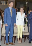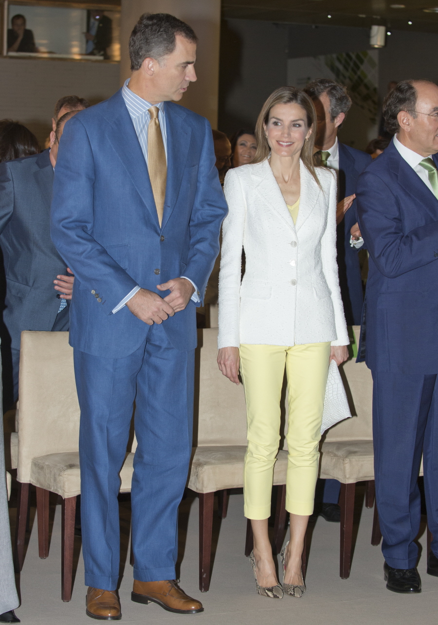 My aversion to skinny jeans has something to do with the fact that I look terrible in skinny jeans. That’s only part of it though. I think a lot of people look bad in skinny jeans, but the skinny-jeans trend is still happening, all over the place, regardless of body type or occasion-appropriateness. And now the trend has happened – perhaps for the first time? – on an actual Queen. These are some photos of Queen Letizia and King Felipe of Spain handing out scholarships and research grants for the Iberdrola Foundation at the Casa de America building in Madrid yesterday.