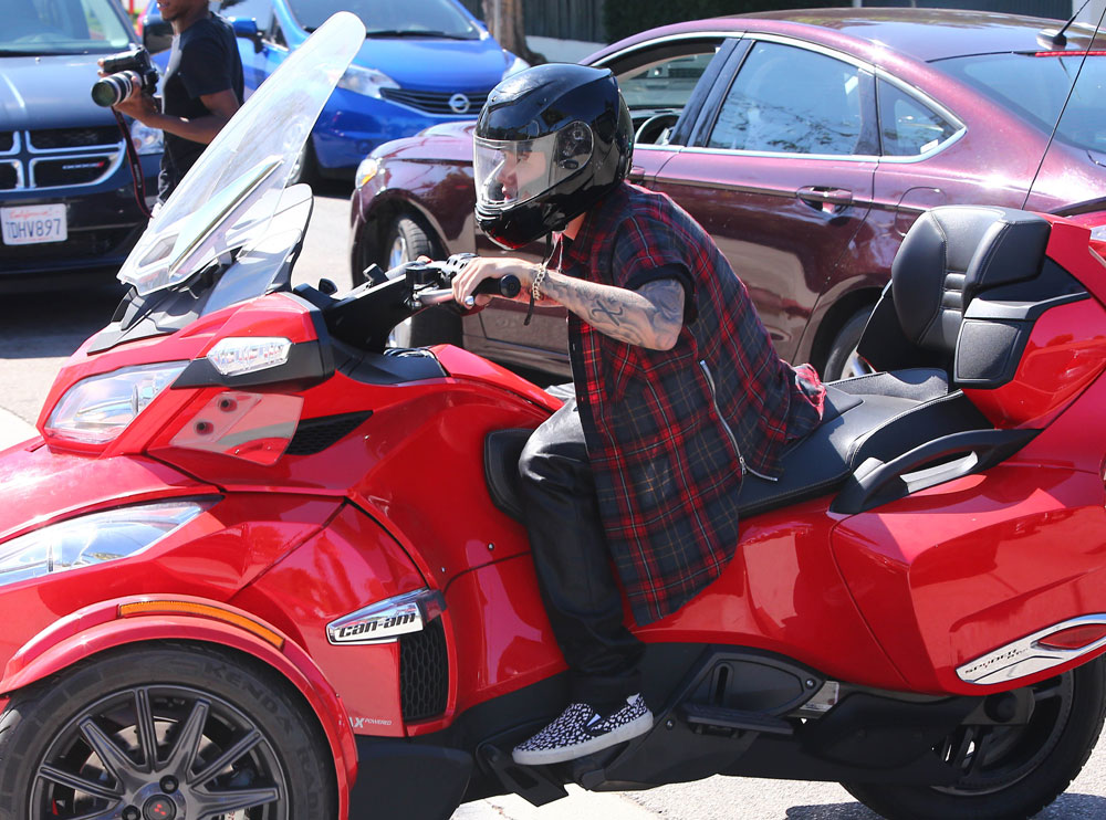 These are photos of Justin Bieber cruising on his fancy Can-Am Spyder motorcycle in LA on Thursday. The situation looks like a simple joyride, but it turned into a near disaster according to TMZ. Remember when Lindsay Lohan drove into a stroller that was holding a baby? She simply refused to check the sidewalk to see if anyone was crossing. This is just as bad. Bieber decided to drive his motorcycle on the sidewalk, and he almost ran over an elderly lady with a walker. TMZ has video of the incident. Here’s the lowdown: