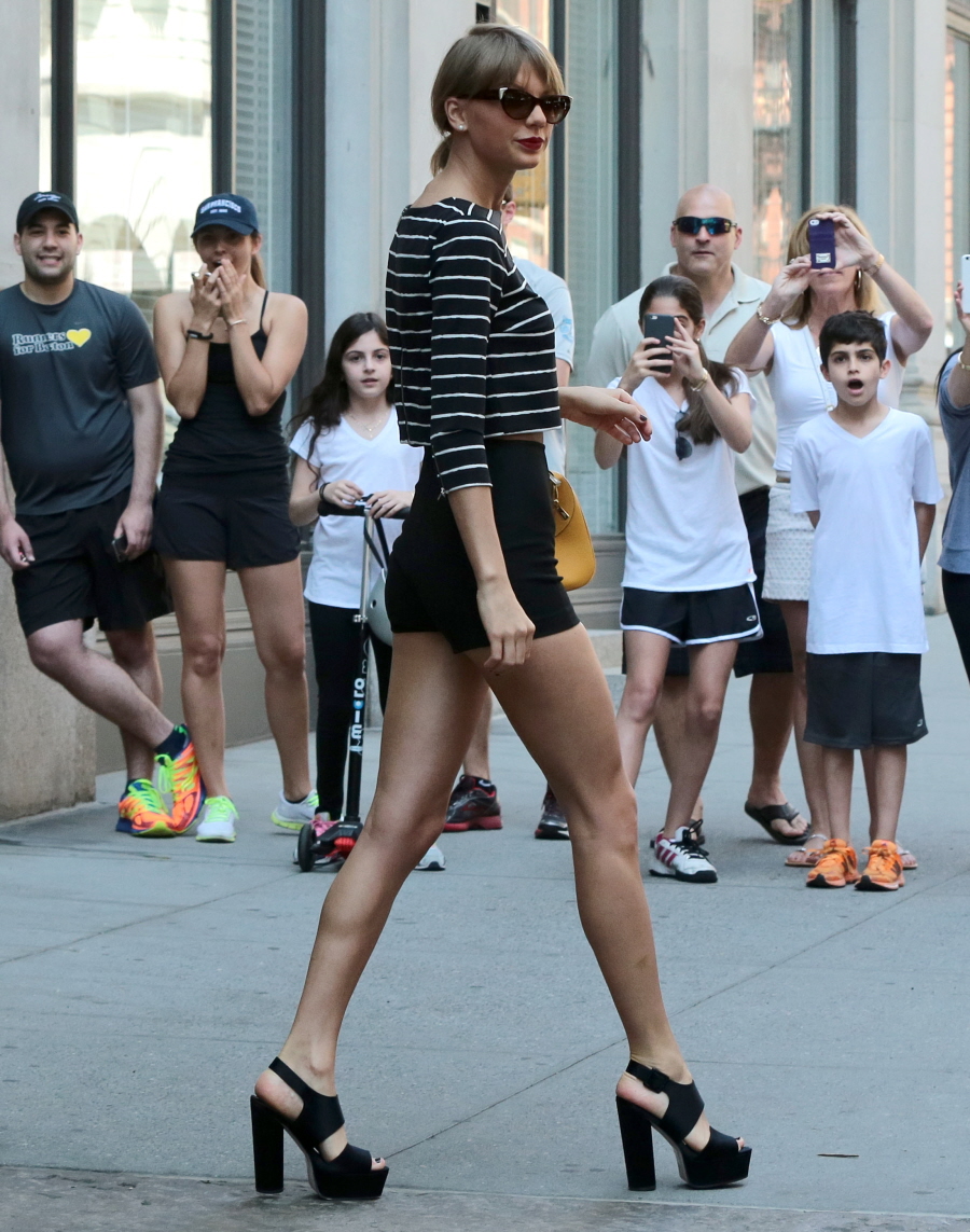 Those shorts are so friggen short, we would side eye any other celebrity wearing them. I’m not sure why Taylor gets a pass. She’s defintely trying to be sexy, it’s just not working. Also, those pics where she’s walking with her girlfriends make me cringe. She sure enjoys a good pap stroll.