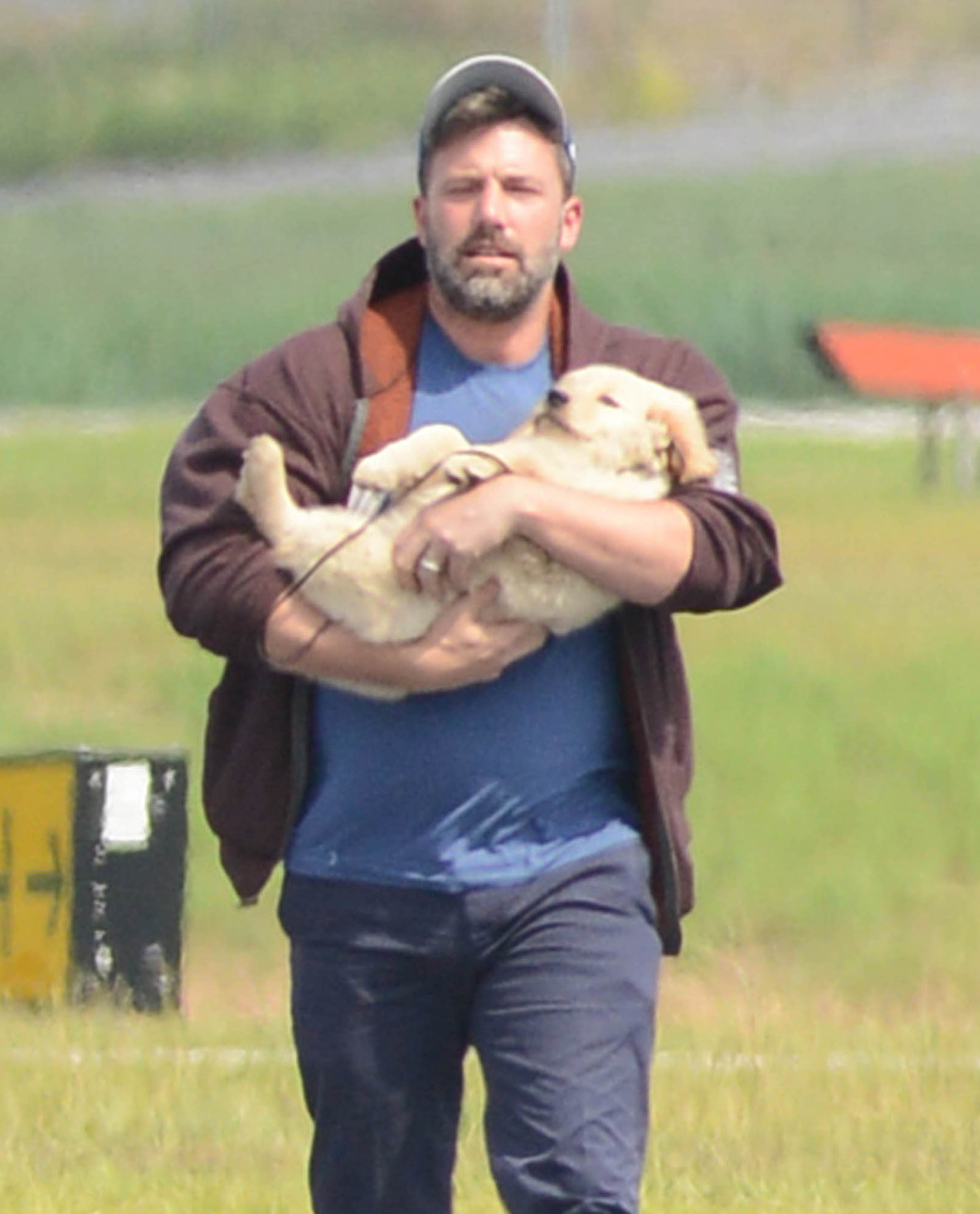 Here are photos of Ben Affleck out in Atlanta, still wearing his wedding ring, but more importantly carrying a beautiful, squeezable golden retriever puppy! Look at that sweet dog falling half asleep while while being cradled! What is this dog’s name? I get the feeling he or she is about to be as famous as Finn. (No one can replace Finn, Finn is the star.) This dog is a clever new prop in a high profile divorce but it does not care at all and looks content as hell to be carried. I’m sure the Garner-Affleck kids love it to pieces too.