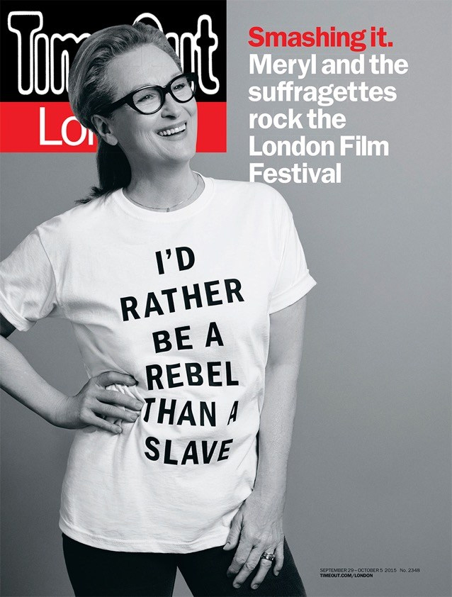 Last week, Bedhead covered Meryl Streep’s Time Out London interview, where the star of Suffragette actually said “I am a humanist, I am for nice easy balance” when asked if she was feminist. That justifiably got a lot of headlines. Also making headlines? The editorial Meryl and the other Suffragette stars did with Time Out London. Meryl, Cary Mulligan, Romola Garai and other actresses posed for Time Out wearing “I’d rather be a rebel than a slave” t-shirts. Which… is very problematic. It’s a problematic message. Rebellion was a choice for women. Slavery was not a choice for slaves. And it’s not either/or, as many are pointing out – there were prominent suffragettes who happened to be black women who were actually born into slavery.