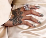 Yikes! Those tattoos combined with her nail color make her hands look like she should be offering an apple to Snow White.