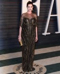 Anne Hathaway came out for the Vanity Fair Oscar party last night, and I’m surprised to see so many sites running these photos. Annie has been taking a break from the spotlight for months now, so I take this whole thing as “people actually sort of miss seeing Annie Hathaway.” Which should make her feel good. You know what else should make her feel good? This totally beautiful maternity look by Naeem Khan. This is sort of ‘70s-inspired but it really, really works. This is maybe the best maternity look I’ve seen in years. Annie looks so beautiful! She’s glowing.