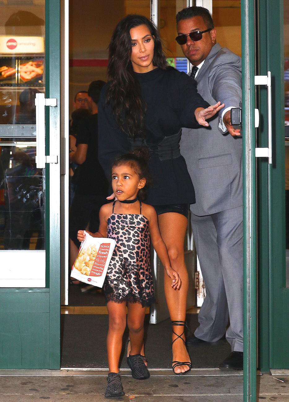 Here are some photos of Kanye West, Kim Kardashian and North West out and about in New York yesterday following Sunday night’s VMAs. North did the outing with her parents during the day, and it looked like she was wearing some toddler-sized slip-dress and toddler-Yeezys? Then in the evening, Kim and Kanye stepped out without their kids. That’s Kim in shorts, a low-cut top and a long duster coat, an outfit that makes no sense.