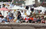 Heidi Klum and Seal renewed their wedding vows this weekend, as they do every year, but instead of heading to their villa in Costa Careyes, Mexico, where travel is restricted due to the H1N1 virus, they had a “White Trash” themed party at home in LA. At first I thought it might be an 80s-themed party, but then I saw photos of pregnant Heidi smoking a cigarette, which was hopefully a prop. She wore her hair in cornrows and had on an over the top white lace sparkling wedding dress and giant costume jewelry. Seal wore cut off shorts, a leather jacket with an American flag on the arm, and a mullet wig. Celebrity guests were seen in curlers, fanny packs, sports t-shirts and baseball caps. Decorations included hanging lights in the shape of flamingos: