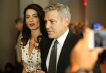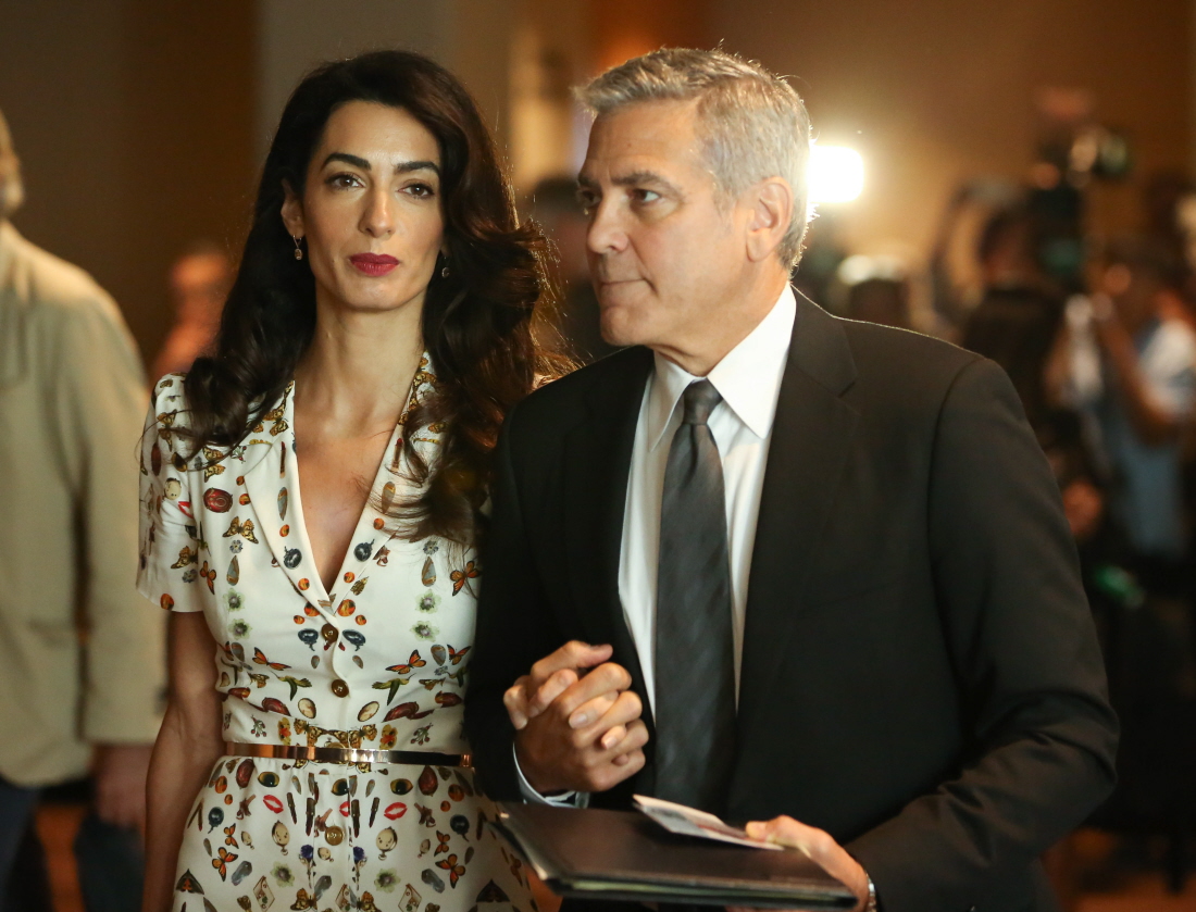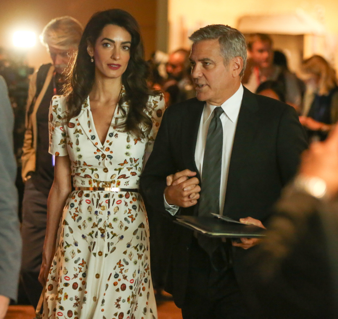 Here are some photos of George and Amal Clooney at the United Nations yesterday. They attended together to take part in UN roundtable regarding refugees, plus they attended President Obama’s final address to the UN (as POTUS, I would imagine that Obama might conceivably address the UN after he leaves office). Amal got some attention for her dress – this is Alexander McQueen, and the pattern of the fabric features butterflies, pocketwatches, flowers and more. If the fabric looks vaguely familiar, it’s because the Duchess of Cambridge wore a similar McQueen dress (with the same fabric) to the Wimbledon men’s final this summer.