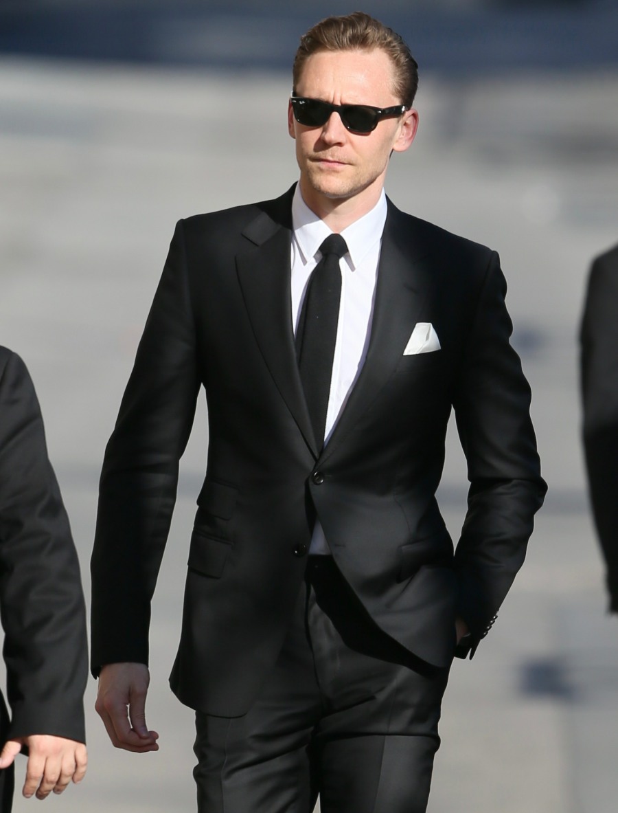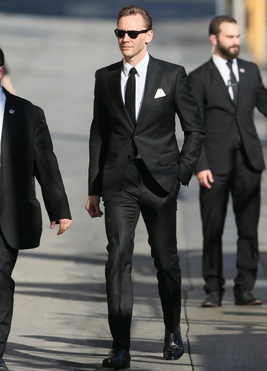 Tom Hiddleston appeared on Jimmy Kimmel Live last night as the main guest, which means he got a few big segments. These are photos of Tom outside Kimmel’s studio, and I have to say: he looks really nice in this suit. He looks like a hot undertaker, or the mourner at a funeral that you would grief-bang. Anyway, the Kimmel interview… if you make it past the first clip, he’s somewhat charming. The problem is the rehearsed bit at the beginning where Tom explains why he was wearing a sombrero at the Mexican premiere of Kong: Skull Island, and then he breaks into song because Tom will never NOT make me cringe.