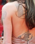 The Huffington Post points out that Angelina is sporting a new tattoo, a small frame-like embellishment to the longitude and latitude coordinates of her children’s birthplaces on her left shoulder. I’m not going to speculate on what it means as it’s hard to tell. She loves getting inked and may have just wanted to highlight the tattoos for her children.