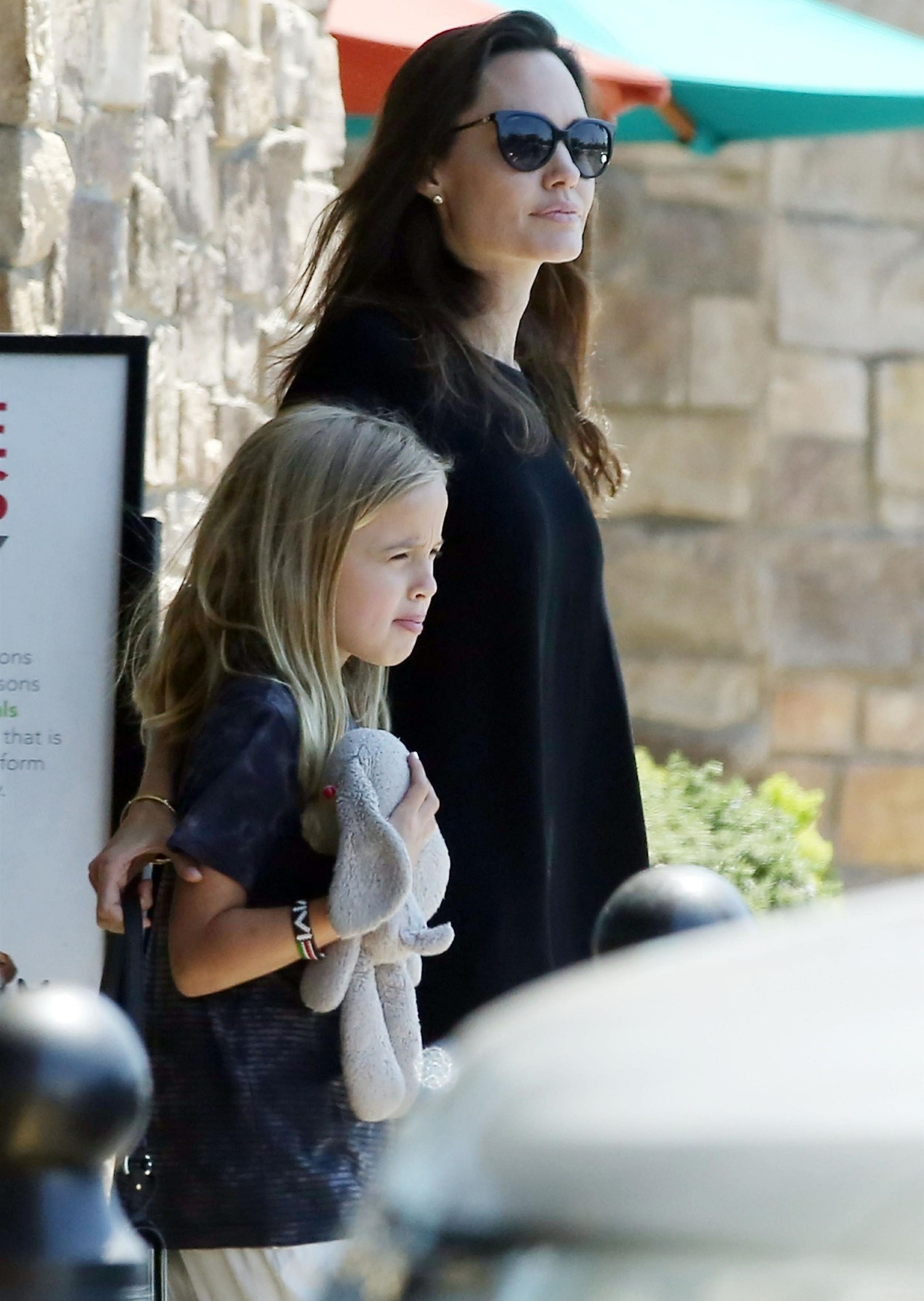 I had several realizations all at once as I looked through these photos of Angelina Jolie and Vivienne Jolie-Pitt out and about in Los Feliz on the Fourth of July. One, I suddenly realized that Angelina Jolie and I both have the same “who cares?” haircut and hair length. I wonder if she went to Super Cuts too? Because it looks like she went into one of those cheap places and told them “Just take a few inches off, I don’t care.”