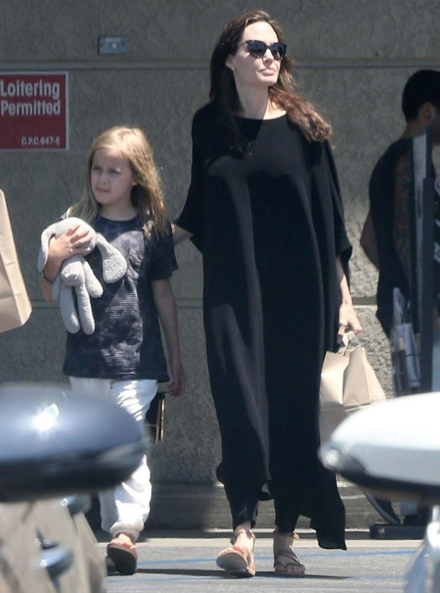 The second realization? I realized that Angelina has now gone Full Sack. While she’s always had a penchant for sack-dresses, this black sack takes it to the next-level. This is just a sheet. A long, black, shapeless, sack-sheet. With some kind of black trousers underneath. It’s so weird. Even when I went through my goth phase in my teens, I veered more towards “figure-conscious witch-wear” rather than shapeless black sacks. Don’t get me wrong, I love that Angelina doesn’t give a crap. It’s refreshing that she wanders around Los Feliz, looking ghoulish and witchy on America’s birthday.