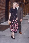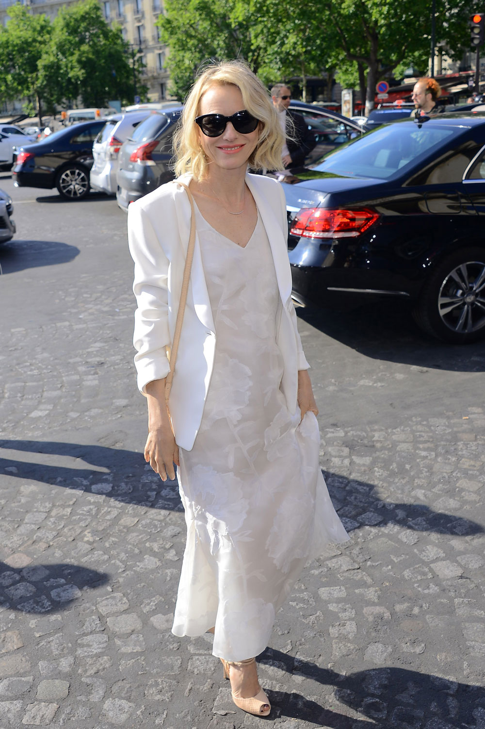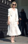 Above is a photo of Naomi Watts in Armani at Paris Fashion Week where I can’t help but feel she got somewhat shafted by the designer. I like the crisp white jacket but it really doesn’t go with that girlish white dress with a floral overlay. Plus she (or a stylist) paired it with a beige purse and beige shoes. All white isn’t that hard to accessorize, you either go with matchy white shoes or dark/jewel tone shoes. Beige just doesn’t work in my opinion, but maybe I’m too much of a layperson to get it.
