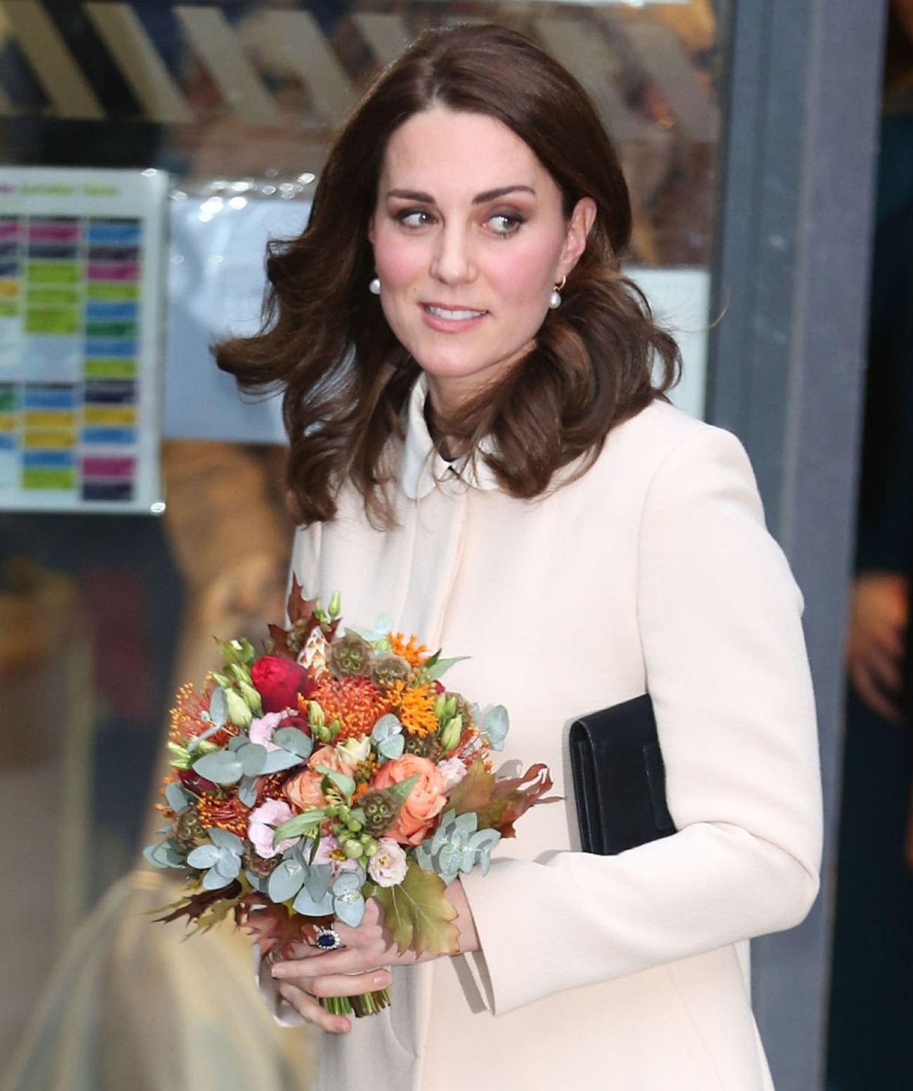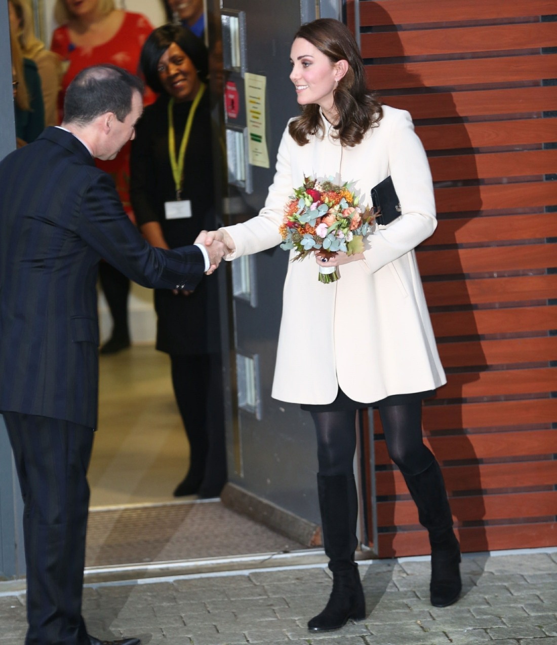 Anyway, these are photos of Kate at the Hornsey Road Children’s Centre in London yesterday. She was supposed to do this event back in early September, but had to cancel it when she became pregnant. She repeated a wool crepe coat by Goat, which she first wore in 2013 when she was pregnant with Prince George. I liked it back then, but it’s irritating me a little bit now. The Goat coat cost about $900 when she bought it years ago, so at least she got some additional use out of it. She styled it similarly for the repeat too – black tights, black dress underneath. She changed the shoes – she wore black heels in 2013, and black boots on Tuesday.