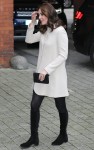Other than the skirt being too short, I think she looks nice. It is a lovely coat. However, I agree with others, regarding her reluctance to take her coat off indoors. It gives the impression she is desperate to rush away.