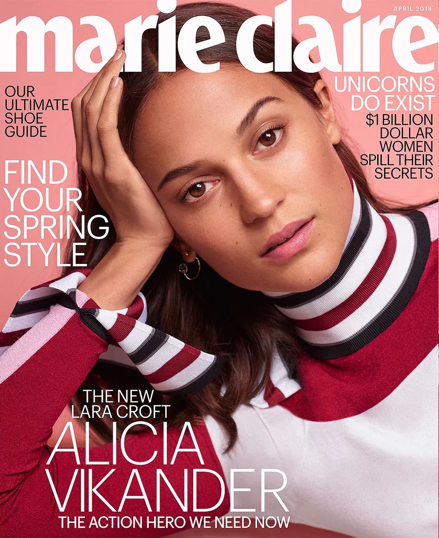 Alicia Vikander covers the April issue of Marie Claire to promote Tomb Raider. This is the best magazine cover I’ve seen from her Tomb Raider promotional tour – while I would not wear that turtleneck, it makes for an eye-catching cover. True story: until I looked it up, I thought Vikander and Michael Fassbender had gotten married in, like, January. No – they got married last October in Ibiza. That’s why there are so many questions about the wedding and being married and all of that in this promotional tour. You can read the full Marie Claire piece here. Some highlights: