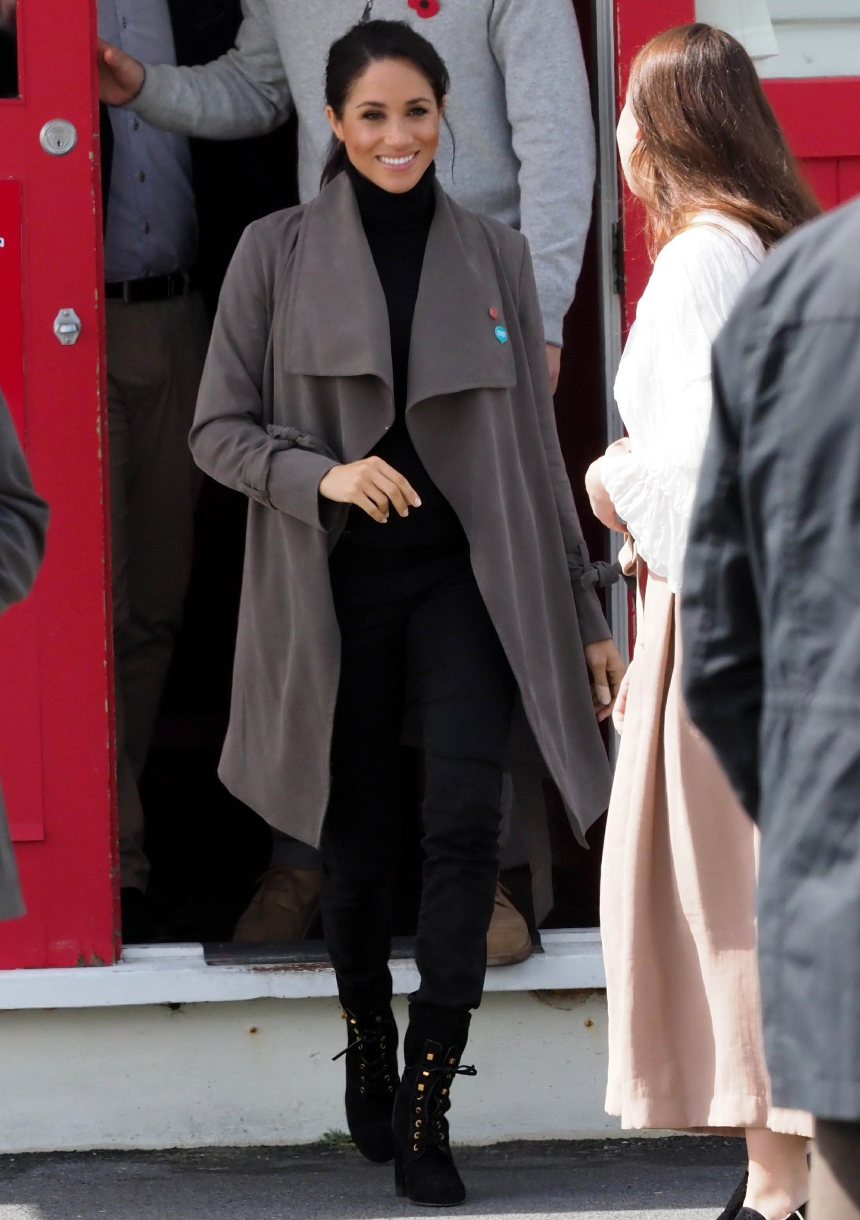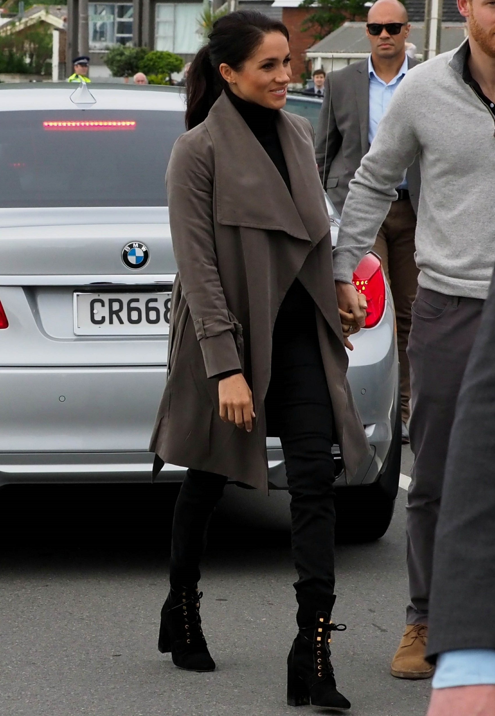 Good lord, I really hope the Duke and Duchess of Sussex get a good rest after this tour. They were still in New Zealand today, which is final leg of their epic South Pacific tour. Early this morning, Harry and Meghan made a trip to the Maranui Cafe in Wellington to highlight mental health with the local group Voices of Hope. They chatted with kids and adults and everything was pretty low-key. Meghan’s outfit reflected that – she wore Outback Denim jeans (the same pair we’ve seen a few times) with a Jac & Jack turtleneck sweater and a Club Monaco trench coat. Meghan and her trenches, my lord. I mean, we’re still getting used to Meghan’s style and she’s still figuring out her “duchess style,” but I hope that her over-reliance on trenches eventually fades away. She runs around looking like she just stepped out of a post-apocalyptic Mad Max-type film half the time. Her boots are Stuart Weitzman.