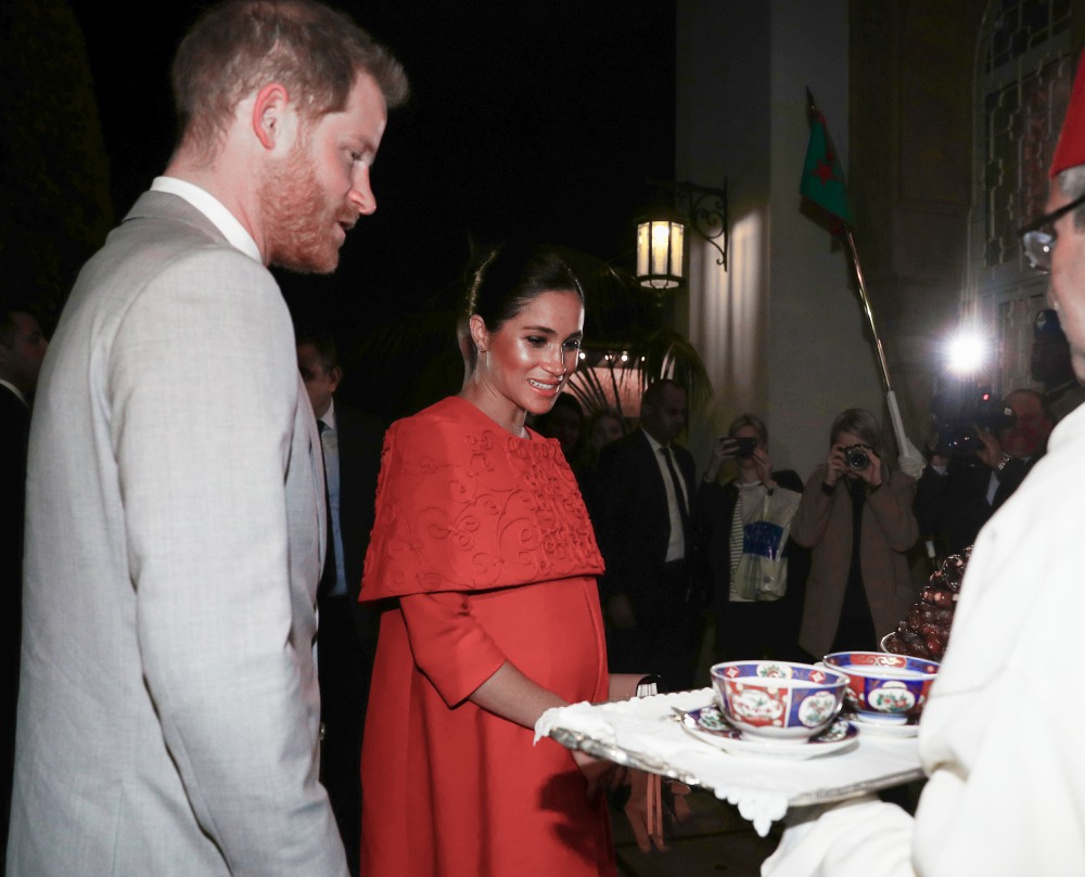 Here are some photos of the Duke and Duchess of Sussex arriving in Morocco on Saturday evening. This wasn’t technically the tarmac “exit” as soon as they got off the plane. They apparently flew commercial, and so there were no exiting-the-plane-waving photos. These photos are the Sussexes’ “arrival” pics at the royal palace. Meghan looked especially glamorous, I think – her red coat is Valentino. Red is a significant color in Morocco, and their flag is almost completely red, so this is a piece of “theme dressing” or perhaps just dressing for the host country. I like that her hair is pulled back in a neat (but not crazy-tight) bun. I don’t like the beige heels or the beige-and-white clutch with this though. There were so many purse or clutch options and she chose that??