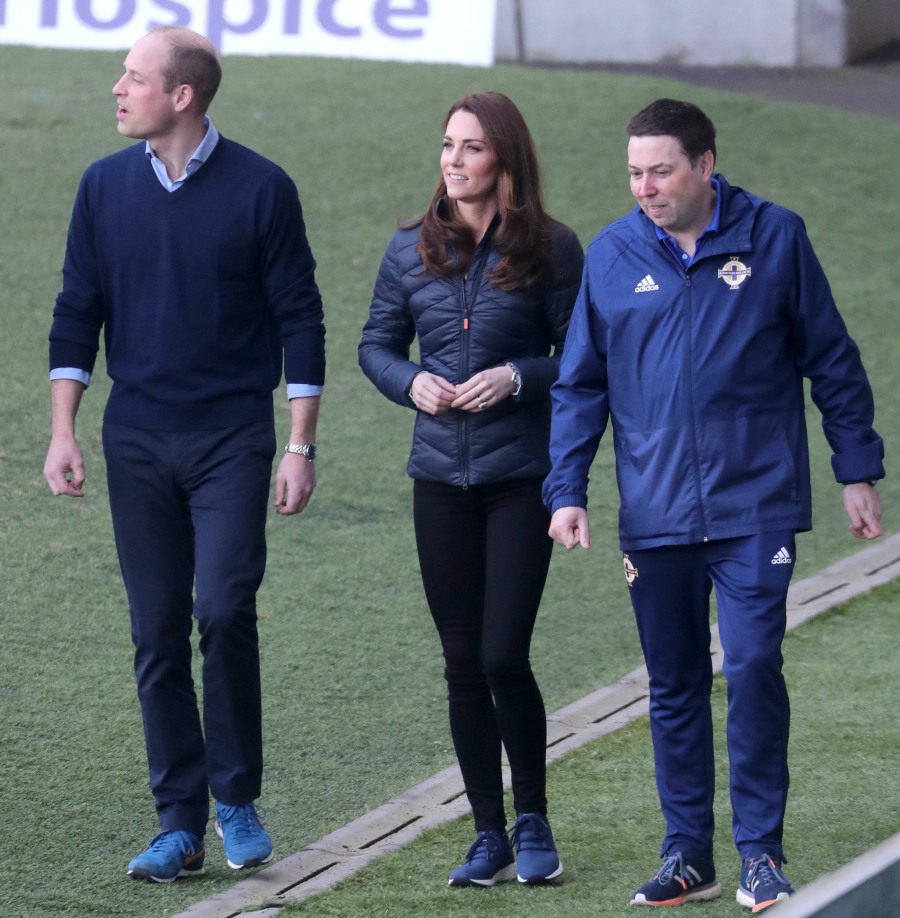 As many of you pointed out earlier, it really looked like the full-skirted Carolina Herrera “coatdress” style clashed with the Duchess of Cambridge’s skinny jeans. That’s because she really wanted to wear her black skinny jeans for the first event in Belfast, but they also had to do a short walkabout upon their arrival, and I guess Kate thought it would be bad form to do the walkabout in athletic gear. So she kept the jeans on, threw the Herrera coat over them, and then she changed coats and shoes once she got to Windsor Park Stadium.