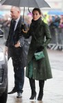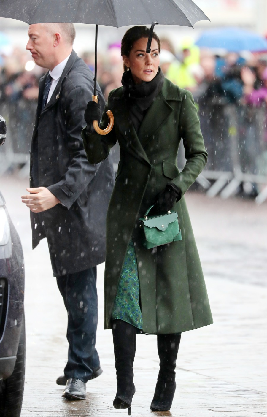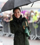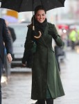 Kate wore an olive-green Sportmax coat (£940) over a Michael Kors “peacock” dress. I’m surprised that she wore a new green coat this close to St. Patrick’s Day – you would think she would have saved it for her somewhat annual trip to the Irish Guards on St. Patrick’s Day. Kate also carried a Manu Atelier handbag (which we’ve seen before), and she was trying to balance that bag with her umbrella. I wouldn’t have been able to pull that off. The purse probably would have landed in a puddle and rain would be streaming down my face. Update: the Sportmax coat is a repeat, apparently.