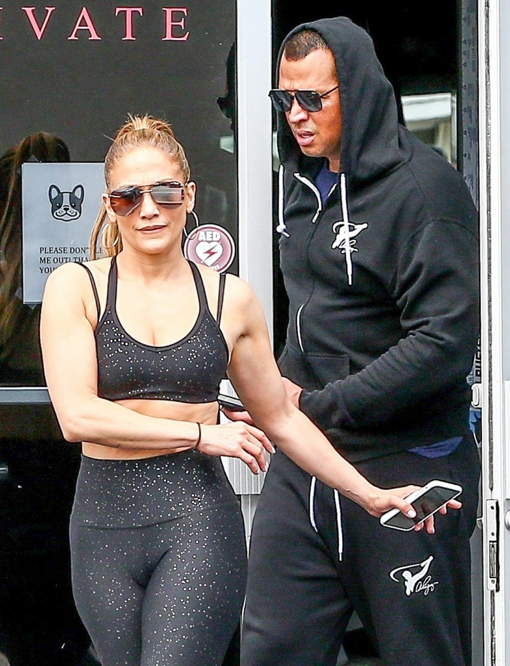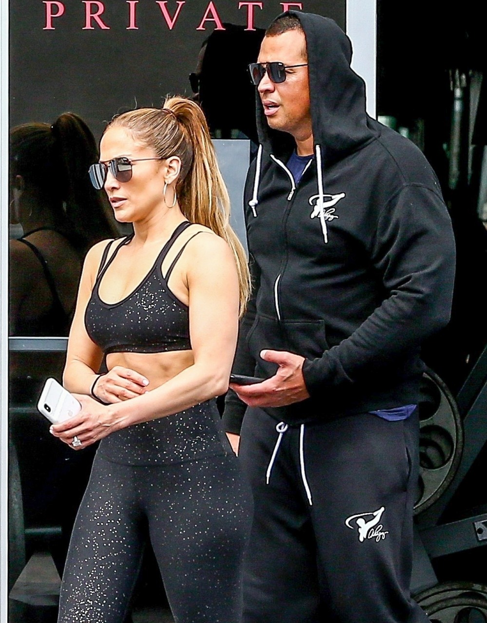 People who can wear lots of jewelry while working out are INSANE to me. I could never wear any kind of rings or earrings to the gym. Jennifer Lopez doesn’t feel the same way – on Friday, she was seen exiting a Miami gym with Alex Rodriquez, after a workout where she wore her gigantic new engagement ring (and big hoop earrings, I can’t). I also can’t believe her body at this point – she’s 49 years old! She’s going to be 50 in July! My ass has never looked that good, not even when I was 18. Anyway, I’m talking about these photos because Page Six did a weirdly exhaustive story about The Love Story of J-Rod and what they’re really like as a couple, and the piece has tons of quotes from a “J-Rod friend” and “sources close to A-Rod.” Some highlights: