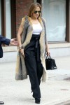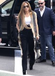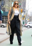 Here are some photos of Jennifer Lopez out and about in New York yesterday. For several weeks, she’s been in NYC filming Hustlers with a splendid cast of ladies (including Cardi B and a banged Constance Wu). Yesterday, Jennifer stopped by a studio and these photos look like they’re part of a magazine photoshoot, mostly because Jennifer’s ensemble looks so uncomfortable. Sometimes her “street clothes” just work, and sometimes it’s a miss. The combo of the high-waisted drapey trousers with the platform heels and the “fur vest”… it’s just a big nope. Jennifer also stopped by a radio station yesterday to chat about life in general, and she talked about whether she’s made any wedding plans with Alex Rodriguez yet: