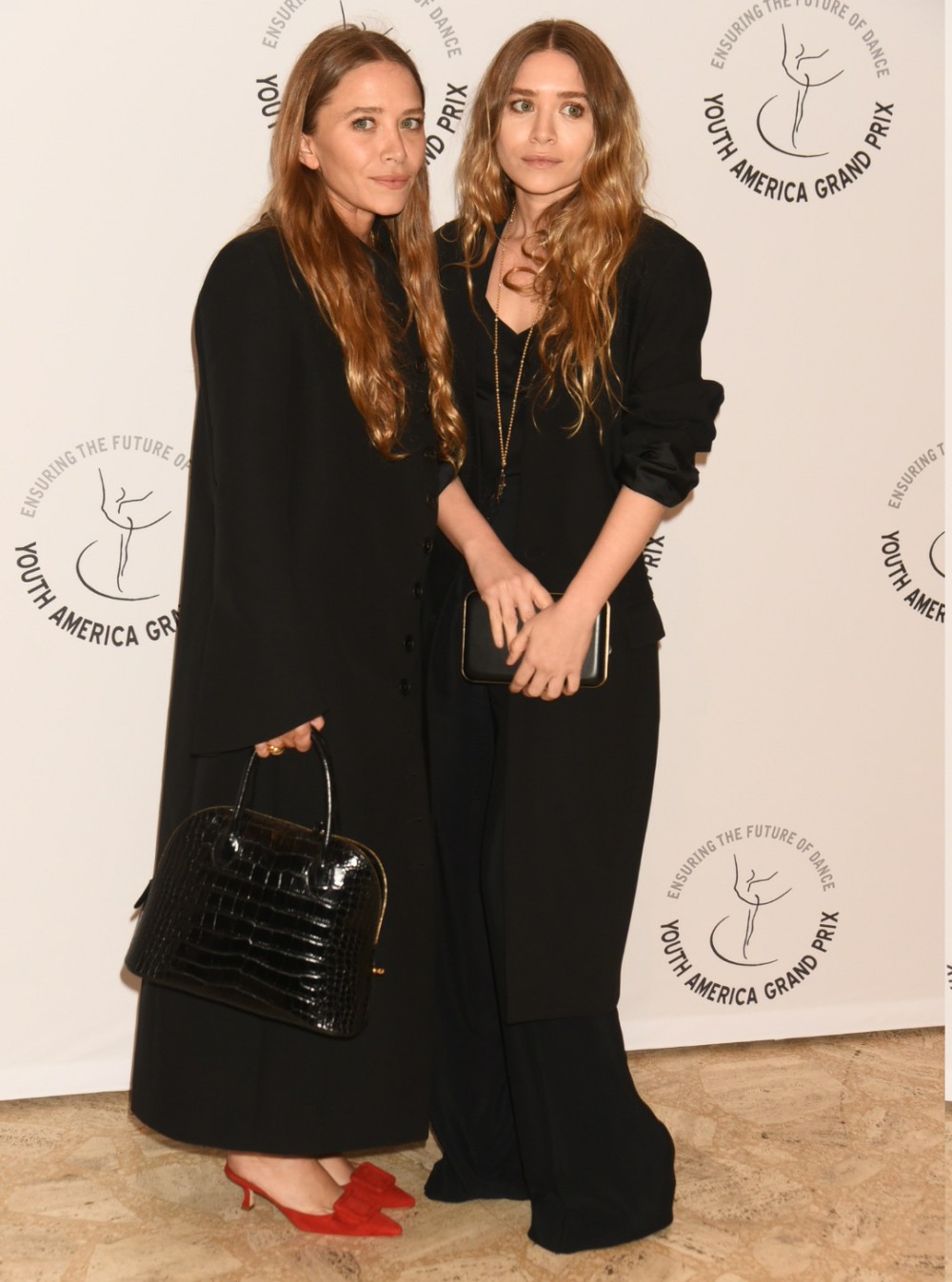 For years now, it’s been pretty rare to see Mary-Kate and Ashley Olsen walk a red carpet together. They maybe do it once a year on average, perhaps at the Met Gala or maybe at some random event that they’re involved with. Like this event last night: the Youth America Grand Prix’s 20th Anniversary Gala. MK and Ashley were each other’s dates, and they did the matchy-matchy goth thing and they posed the same way they always do – standing angled towards each other, faces close. They’re so creepy, it’s actually pretty funny.