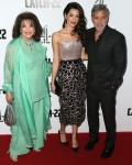Here are some photos of George and Amal Clooney at the London premiere of Catch-22. Amal’s mom Baria Alamuddin joined them at the premiere, and in a few photos, you could see George motioning Baria over to pose with them on the carpet. I find that interesting! Amal seemed to just want to pose with her husband, but George was like “let’s include your mom!” No wonder why it feels like Baria is a huge fan of George. As for Amal’s outfit, I don’t have the ID for it, but it’s okay. It’s not my favorite, but I like it better than a lot of stuff she’s been wearing lately. I feel like the skirt is the centerpiece and the top should have done more to bring attention to the skirt.