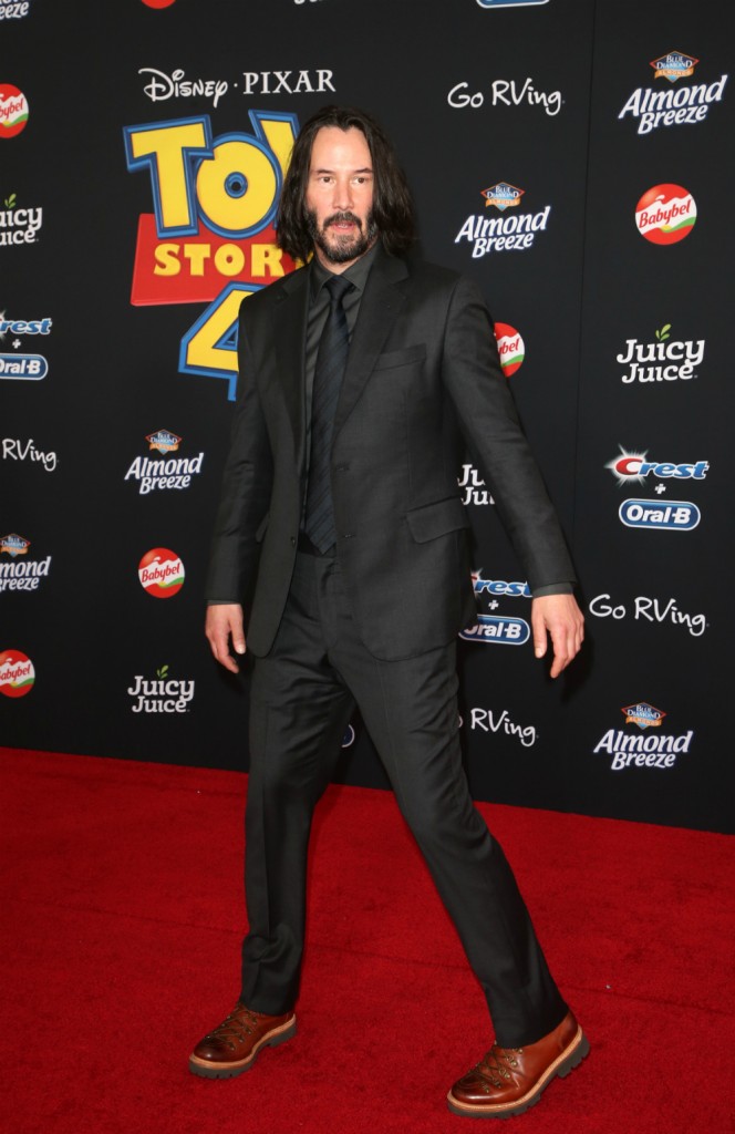 Keanu Reeves is everywhere at present and I, for one, couldn’t be happier. He’s graced us with promotion for Always Be My Maybe, John Wick: Chapter 3 – Parabellum, the Cyberpunk 2077 video game and now he’s doing promotion for his voice role as Duke Caboom in Toy Story 4 (which is getting incredible reviews, btw – I‘m so glad). During the red carpet for the TS4 premiere, Melody Chiu from EW/People TV seemingly revealed to Keanu that he was the internet’s current obsession. Since Keanu doesn’t have any social media accounts, he was surprised to hear this. Does he also not have a manager, agent or know anyone who’s been outside in the last year? Keanu is everywhere right now – how is this a surprise?