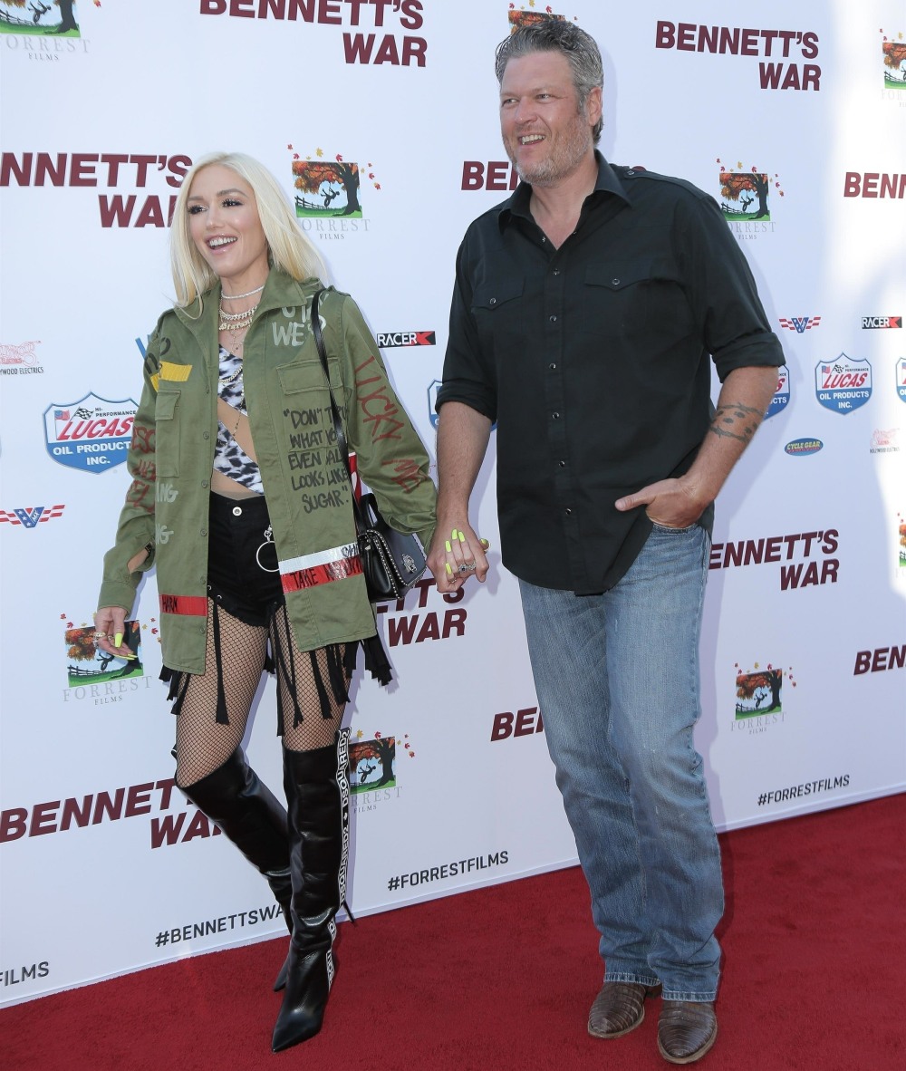 Last night was one of their date nights, I guess. They went out to the LA premiere of Bennett’s War, a film about a guy with the Army Motorcycle Unit who gets injured in an IED explosion and ends up becoming a motorcross racer to earn money to save the family farm. I sh-t you not, that’s the actual premise of the movie – you can see the trailer here. Country music star Trace Adkins plays the soldier’s father, and judging from the photos, Blake and Trace are tight and that’s why Blake and Gwen came out to support the film.