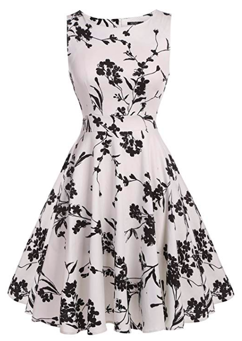 Lila asked if we could find a floral dress like the one Angelina Jolie wore to a Maleficent press conference. I used to own a white skirt with a black floral print which I loved and Angelina’s dress reminds me of that. It was hard to find both the cut and a similar print, so I found two separate dresses depending on what you’re looking for. This sleeveless vintage look a-line cocktail dress comes in sizes small to xx-large and in that lovely floral print along with eight other print and color options. Plus it’s under $30! This is such a cute dress that would look professional at work or out to a show. It has 763 ratings, 4.5 stars and an A from Fakespot! Women say it’s “stretchy and so comfortable,” “just as beautiful as advertised,” that it fits great and that they get a lot of compliments.