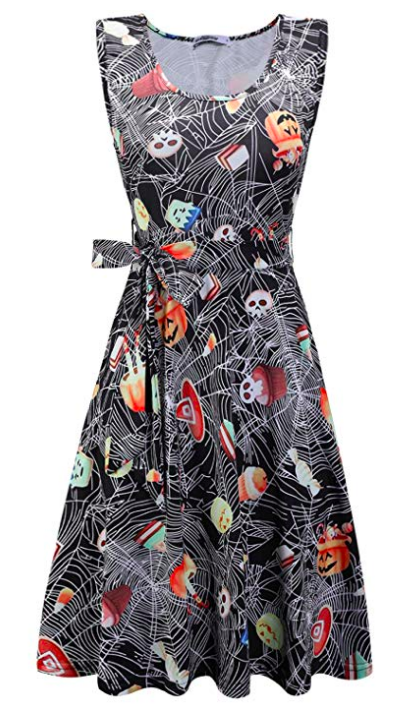 I just learned that Halloween print dresses exist. Given all the other Halloween-themed clothing I already have, I should be less excited about this. This wrap dress by Glorystar is under $25 and comes in both long and short sleeve options. There are 12 different colors and prints, including two which are Halloween-themed. It’s available in sizes small to xx-large. It’s called “elegant,” “comfortable,” “soft” and festive. The reviews include photos of women of all body types looking cute in it. Here’s a link to another Halloween-themed dress by Styleword, it’s a sleeveless cocktail dress with a sash belt, which has so many cute prints.