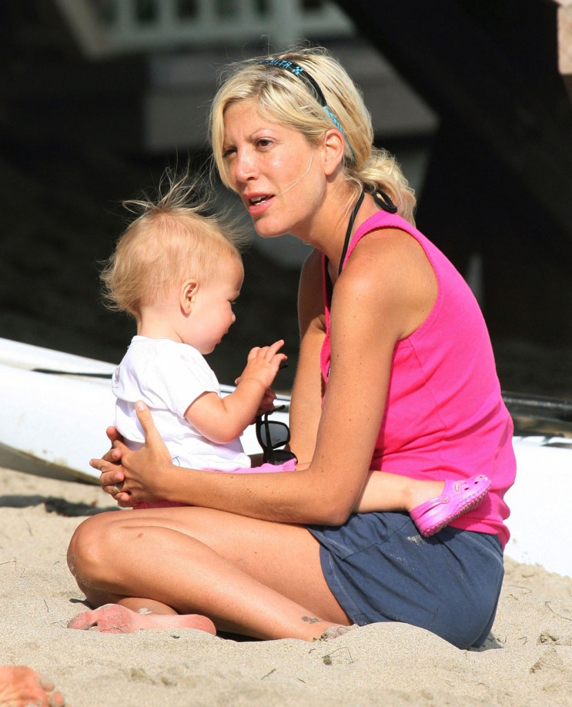 I still have no idea how Tori Spelling got such adorable children – little Stella doesn’t even look like either of her parents. Stella does seem to have inherited her grandmother Candy’s diva attitude, though, because this baby is not happy to be on the Malibu beach. These photos are from a little visit Tori and her family had over the weekend – Tori looks good (for her) and seems happy in the photos. Stella, not so much. Looks like Stella’s having herself a Malibu tantrum on the sand. The baby needs a little hat, perhaps? Her little scalp is going to get sunburned. I bet that sand is hot too.