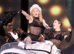 Madonna fainted twice while performing in Bulgaria on Saturday. It seems kind of inevitable given her grueling tour schedule and, ahem – age. She’s massively fit, but she also reportedly adheres to a strict diet, one that sometimes hovers around a starvation-level 800 calories a day if her scheming personal trainer is to be believed. There have also been stories that she doesn’t eat meat or dairy products. That level of exercise coupled with not eating has got to take a toll. The Sun has a video of one of the incidents, and Madonna clearly faints for a moment while dancing to Holiday, and one of her backup dancers holds her up and revives her. She then goes right on with the show:
