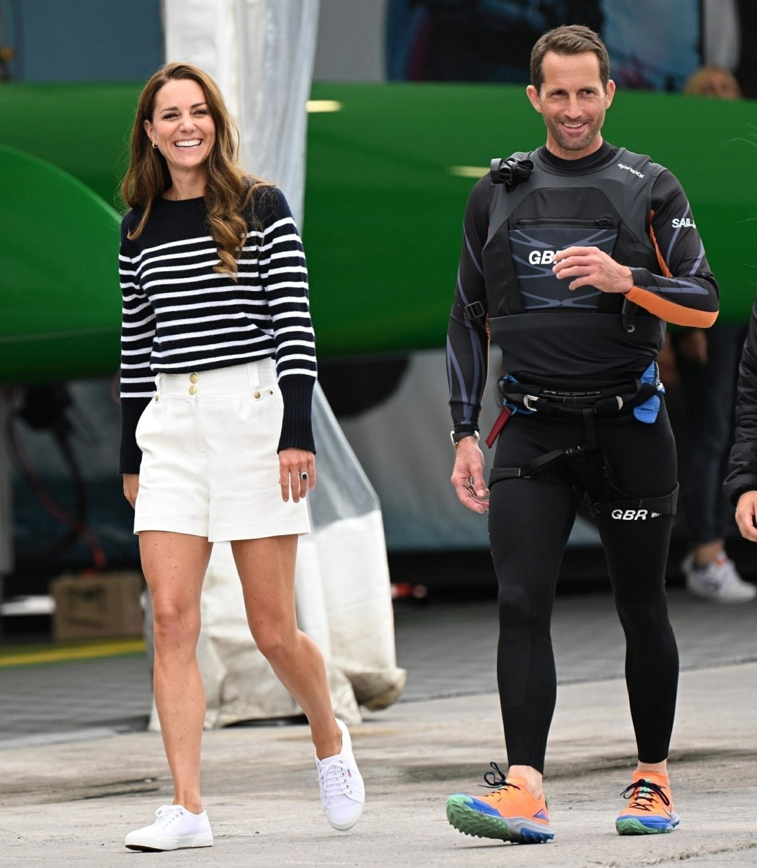 The Duchess of Cambridge stepped out on Sunday for one of her favorite kinds of events: a sailing race with Ben Ainslie. To make this event even better, Kate went solo – no Prince William acting and looking like a bump on a log. Kate got all dolled up too, with a face full of makeup, a head full of hairpieces and shorts with big, shiny gold buttons. She has a million navy-and-white striped sweaters and tops, but the shorts are new. They’re from Holland Cooper and retail for $242 (insane) and they definitely have the same kind of high-waisted, flared cut that we’ve seen on another royal woman recently. Those shorts are so unflattering on Kate, my goodness. Kate also wore her favorite Superga sneakers. That was all before she changed into that wetsuit or whatever it’s called.