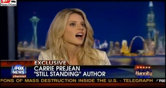 For all you can say about Carrie Prejean, the adjectives “hypocrite,” “self righteous,” and “narcissistic” coming immediately to mind, she sure knows how to promote herself. Prejean is currently shilling her now ironically titled book Still Standing: The Untold Story of My Fight Against Gossip, Hate, and Political Attacks in light of the news that a sex tape has emerged in which she is the only star. Last night Prejean was on uber-tolerant Fox show Hannity and not only did she acknowledge the fact that there was a solo sex tape, she also discussed how she made it. She said she was a teen at the time (hence TMZ passing on publishing it) and recorded it as a present for the boy she was dating, calling it “bad judgment,” “embarrassing” and “humiliating.” She also said “I’m taking total responsibility for it.” As much as I think that Carrie is full of it, she um handled this really well. (I have to admit that some of the stuff she said had me snickering like Beavis and Butthead at the double entendres. I know, I’m mature.)