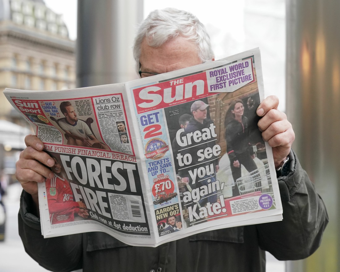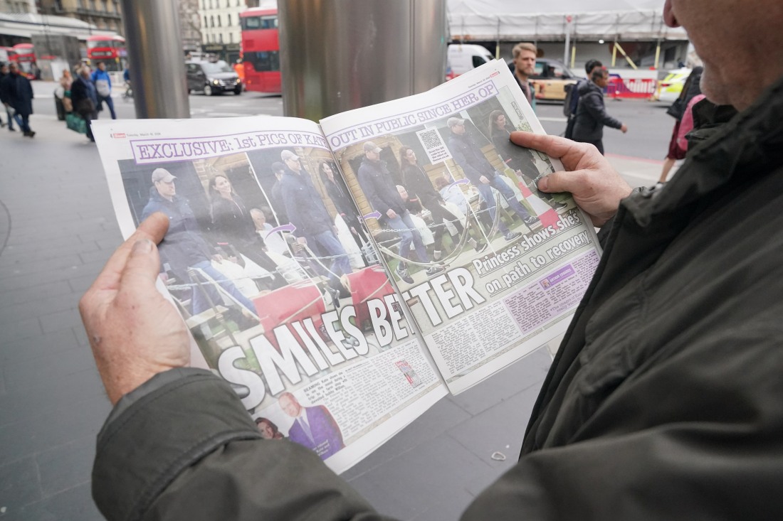 - A man reads a copy of The Sun newspaper in central London which shows the Princess of Wales with the Prince of Wales during a visit to a farm shop in Windsor. Where: London, United Kingdom When: 19 Mar 2024 Credit: PA Images/INSTARimages **NORTH AMERICA RIGHTS ONLY**