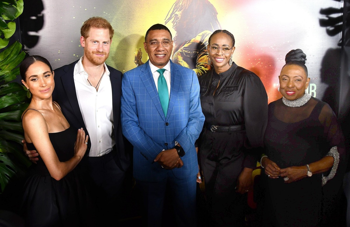 - KINGSTON, JAMAICA – Prince Harry and his wife, Meghan Markle made a surprise appearance at the world premiere of Bob Marley: One Love in Jamaica as King Charles prepares for a prostate operation and Kate Middleton is a week into her hospital stay. Pictured: Prince Harry, Meghan Markle, Andrew Holness, Juliet Holness BACKGRID USA 23 JANUARY 2024 USA: +1 310 798 9111 / usasales@backgrid.com UK: +44 208 344 2007 / uksales@backgrid.com *UK Clients – Pictures Containing Children Please Pixelate Face Prior To Publication*