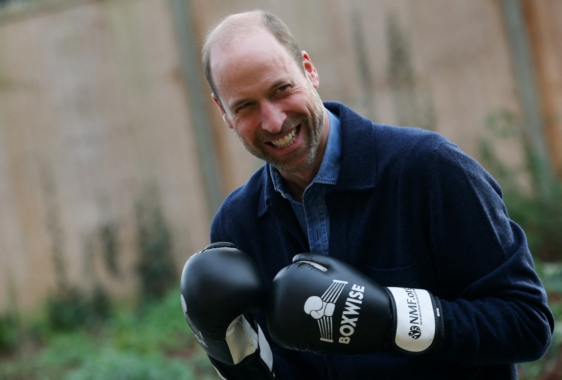 His beard could not look uglier if he tried. It’s coming in brunette and he was a blond? (Not that there’s much evidence on his head of WHAT color it was because . . . bald.) And who is he punching? Harry? Kate? He is sick and twisted and UGLY. He is such a lightweight. Why the boxing gloves. He is an idiot? New thought: could King Charles order him to shave his beard?
