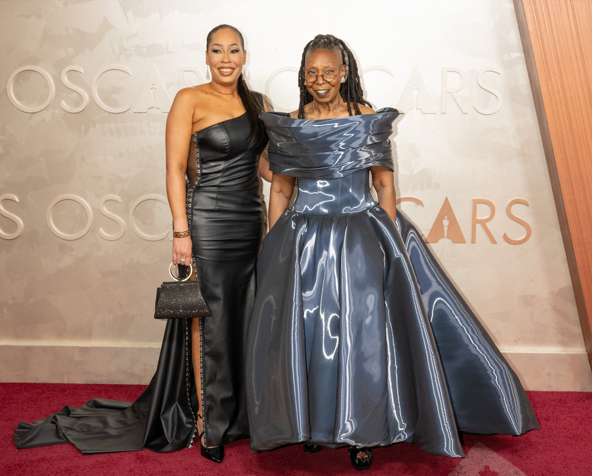 Really love Halle’s dress. Especially in motion. He made sure she could move in it. I enjoyed the Bond performance but couldn’t figure out why Raye had the microphone wire pulled over her shoulder like an accessory. All the dresses in this post are great, even Whoopi’s daughter!