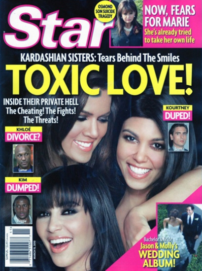 Star Magazine and In Touch Weekly seem to have very similar cover stories this week, both about how the Kardashian sisters have “toxic love” with their men, because their men are “humiliating!” them. My favorite is the Star Magazine cover, just because I’m loving the insets of the men. Khloe’s husband Lamar gets the note: “Divorce!” Scott Disick gets “Duped!” and Reggie Bush gets “Dumped!”. In Touch looks pretty good too – the main gist of their story seems to be that Scott Disick is a douche. Oh, and his initials are STD. Which… I mean… his parents are insane.