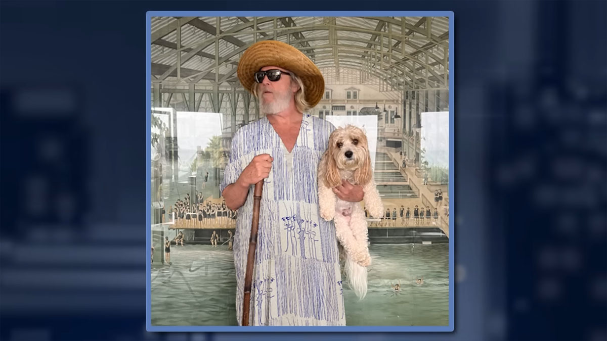 Anyway, his whole appearance makes for a delightful 13 minutes, with a bit of breaking news from Jeff. Coming soon: Jeff’s line of muumuus! Only he just calls his design the “mu.” Seriously, he even shared photographic evidence of him donning one, with a very befuddled looking floof named Monty in his arms. (And as a daughter of San Francisco, I couldn’t help but notice that in the pic he’s standing in front of a poster of the lost but not forgotten Sutro Baths.) At 75 years young, Jeff noted that comfort is king these days, hence how he became fond of the muumuu. No idea yet when his designs will be available, but they will feature his own art and are being made with Cozy Earth. The Dude abides… wearing a dress.