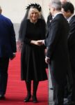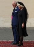 So, let’s talk about Camilla and what she’s wearing? There’s a dress code in Vatican City, for general visitors, including women not exposing their knees or shoulders. Specifically for Protestant women who are heads of state/first ladies/queen consorts, women are expected to wear black and be as covered-up as possible, with some kind of head covering. Incidentally, there’s an exception for Catholic queens, like Spain’s Queen Letizia – it’s called “privilège du blanc,” which means they can wear white when they’re meeting a pope. So, Camilla is an Anglican divorcee and adulterer, and as such, she had to wear black and some kind of head covering. I’m not sure they were expecting THIS headpiece though. What in the world?