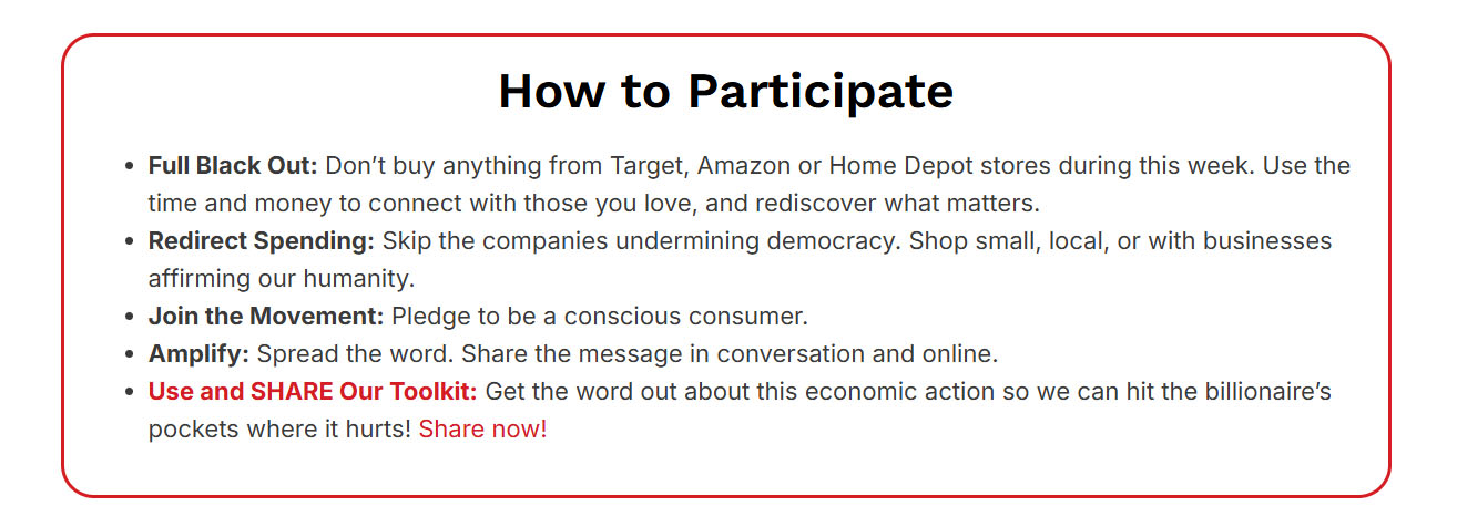 The “We Ain’t Buying it” economic pressure campaign, led by Black Voters Matter, Until Freedom, and Indivisible, calls on consumers to boycott Target, Amazon, and Home Depot from Black Friday, Nov. 28, through Cyber Monday, Dec. 1.