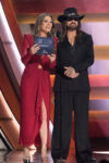 Hurley presented the single of the year award, which went to Ella Langley and Riley Green for their hit song “You Look Like You Love Me.” Sporting a floor-length gown and platform heels, Hurley sizzled in red while Cyrus opted for a black ensemble complete with a silk shirt and a cowboy hat.