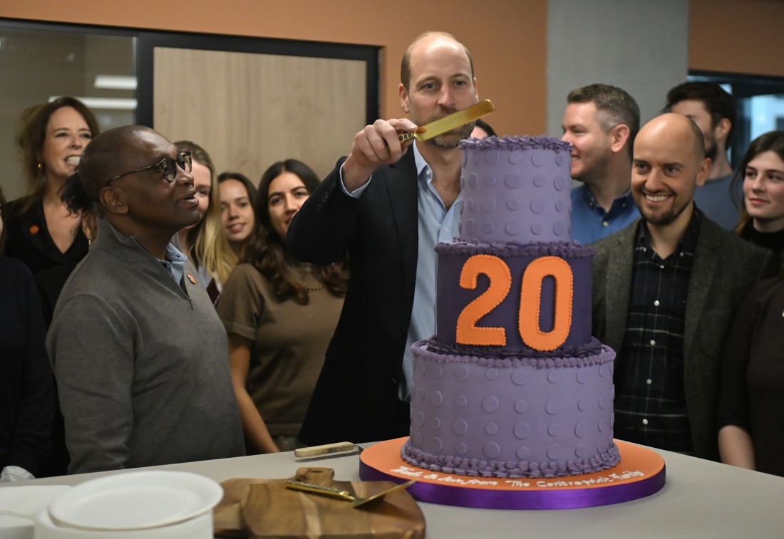 Yesterday, Prince William visited Centrepoint, the homelessness charity. William has been Centrepoint’s royal patron for 20 years, and his visit was to mark the 20th anniversary. They gave him a cake! The cake was made by “royal baker” Juliet Sear, who has been baking cakes for royals for more than a decade. She apparently knows their tastes, and she knows that William has a sweet tooth, especially for chocolate? Which I didn’t know. She told Vanity Fair: “William is a huge chocolate fan, so I slipped a chocolate biscuit tier into the cake, as I know it’s one of his favorites… It’s a three-tiered chocolate truffle fan, which I know William will love. It’s very rich and very delicious and basically pure chocolate.” Maybe he genuinely loves chocolate, but he was giving that cake a thousand-yard stare for some reason. If I was presented with a giant chocolate cake, I would look a lot happier, that’s all I’ll say. He was probably thinking up some rude insults about the cake. That’s my guess. As for William showing up for one of his few charitable patronages, the Telegraph covered some of his comments and they also got some quotes from Centrepoint’s chief executive.
