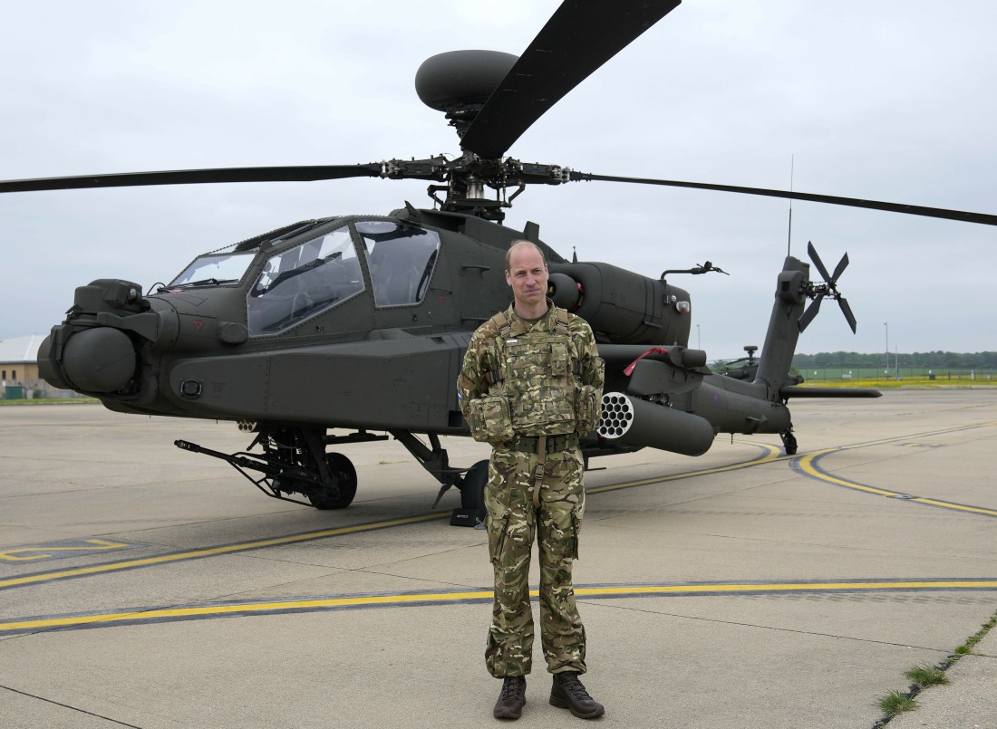 - Britain’s Prince William stands in front of an Apache helicopter at the Army Aviation Centre in Middle Wallop, England, Monday, May 13, 2024. King Charles III officially handed over the role of Colonel-in-Chief of the Army Air Corps to Prince William, The Prince of Wales.,Image: 872590487, License: Rights-managed, Restrictions: WPA POOL GETTY PA AFP REUTERS NPA IPA CPNA IN, *** NO UK USE FOR 48 HRS ***, Model Release: no, Credit line: Kin Cheung / Avalon
