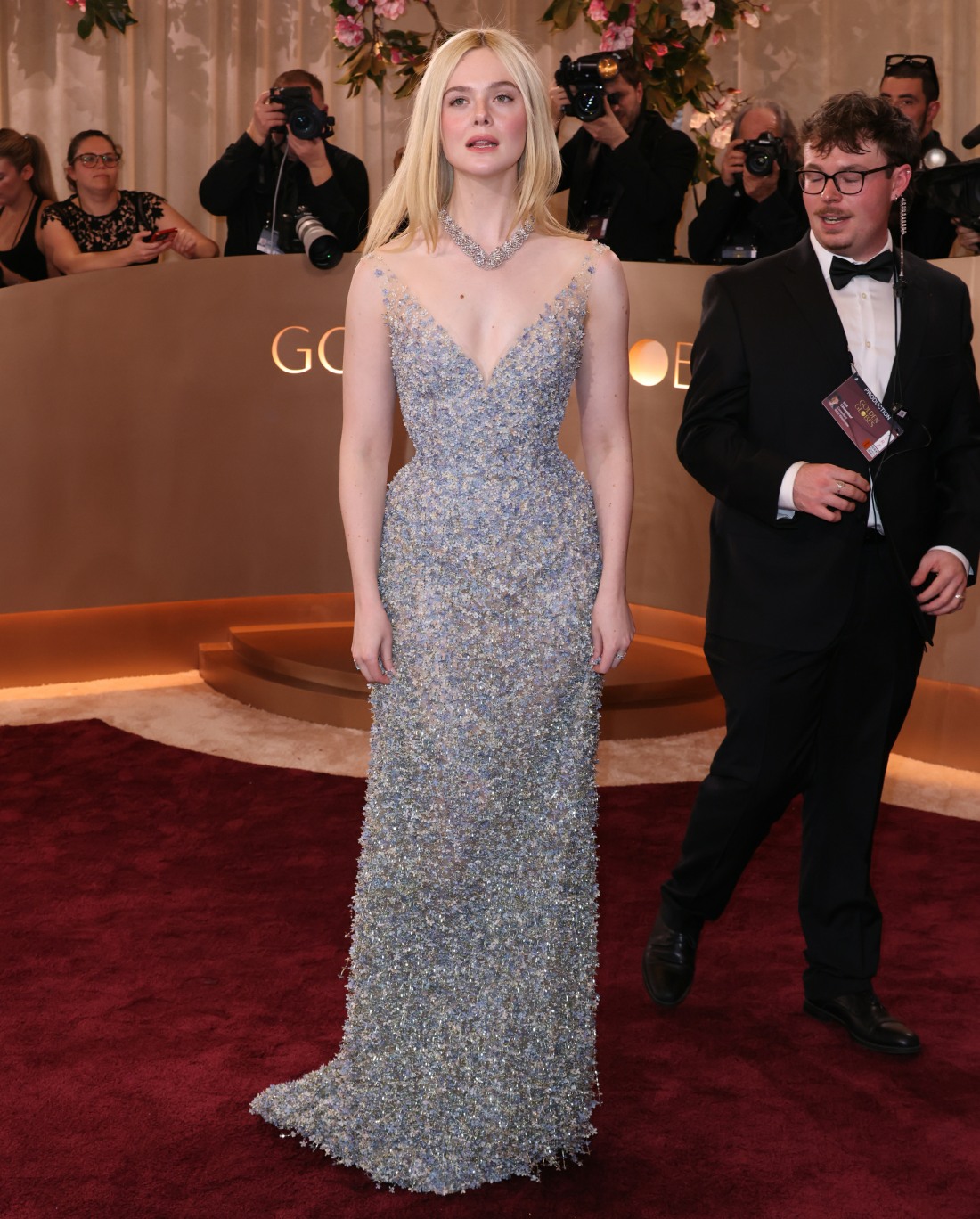 The Fanning sisters both attended the Golden Globes last night. Elle Fanning was nominated for her supporting role in Sentimental Value, and Dakota attended to support All Her Fault, which had several nominations. Elle has such a high-flying career these days, but Dakota is holding her own. Dakota has really leaned into miniseries and limited series these days, I think she’s done like three limited series in a row. Anyway, the head-to-head fashion face-off is inevitable, but I thought both sisters looked really nice. Elle wore Gucci, with Cartier jewelry, including that incredible necklace. There’s a subtle pattern on her dress which is supposed to be a reference to Norway, because Sentimental Value is a Norwegian film. Have we seen Elle in similar gowns? For sure. But I liked this, it’s flattering and she was having fun.