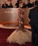 Last year, Jennifer Lawrence was putting herself out there like she fully expected to be the centerpiece of an Oscar campaign for Die My Love. Her promotional tour was a throwback to when she used to get nominated in back-to-back years. Alas, people really did not like the film and J-Law’s performance hasn’t gotten the buzz she was expecting. Still, she showed up at the Golden Globes last night and tried to get attention. I guess that’s what this is. In case you’re wondering, Jen is still a Dior ambassador, although she’s been mixing it up on red carpets in the past year. At the Globes last night, she wore a custom Givenchy dress. Speaking of throwbacks, this looks like something from 2004. Illusion netting, strategically placed fabric on nether regions, and bad styling all around. What is she doing? This isn’t it. We always complained about her boring Dior gowns on every carpet, but maybe Dior was doing her a favor if this is what she chooses for herself. She’s one of my pics for worst-dressed of the Globes. Also: her bangs are supposed to distract from whatever she’s doing to her face these days.