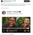 Early Friday morning, Donald Trump was raging out on Truth Social, his Nazi social media platform of choice. Trump often stays up all night, ranting like a lunatic online and sh-tposting conspiracies and racist memes. He has the intelligence, diet, health and emotional stability of a 13-year-old methhead. Well, Friday morning’s sh-tposting bonanza was especially notable because he posted an AI clip of Barack and Michelle Obama’s faces sloppily pasted onto the bodies of two monkeys or gorillas. After he posted that, Trump spent the next 20 hours lying about who did it, what the clip meant and why he did it.