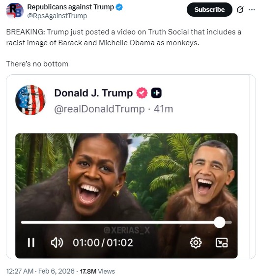 Everyone is acting like the rest of the video (before the obscene Obama clip) is irrelevant to this story. As I commented Friday, the racist clip is very much related to the phony voter fraud conspiracy theory promoted in the first part of the video which centers around supposed cheating in majority Black cities. All the big blue cities are targeted by MAGA because they are Black. This is the vote which Trump and Stephen Miller want to suppress. It’s why SCOTUS is about to completely gut the Voting Rights Act. And it’s why there was a very clear subliminal racist message about why Black people should not be voting at the end of the video.